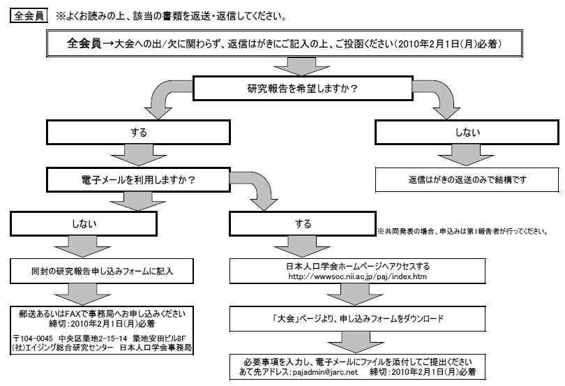 2010年2月1日(月)必着で、同封の返送用ハガキを必ずご返送ください。電子メールの利用についてのアンケートが含まれておりますので、報告を希望しない方や大会不参加の方もご協力をお願いいたします。